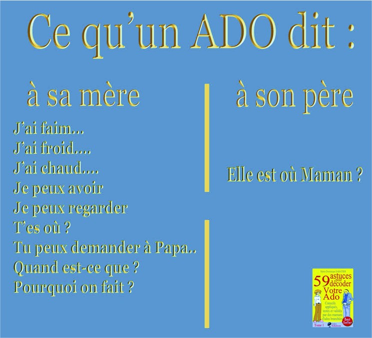 Les parents d’ados ont beaucoup d’humour surtout lorsque les blagues portent sur leurs chers ados. C’est pourquoi je republie cet article vu déjà plus de 93000 fois. Voici celles qui ont eu le plus de succès sur ma page : Facebook « 59 astuces pour décoder votre ado ».