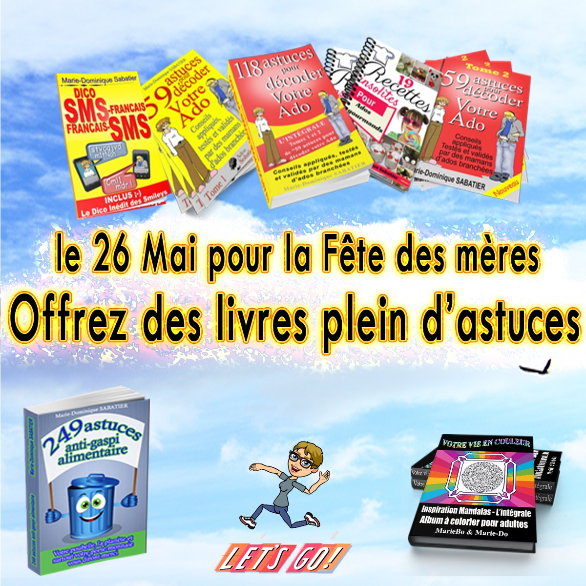 Quelle meilleure idée que d’offrir ou de se faire offrir pour la fête des mères des livres plein d’astuces sur les ados, des dicos sms ou smiley, de recettes insolites de gâteaux pour vos ados ou des livres de coloriages pour adultes et le petit dernier avec des astuces anti-gaspi alimentaire qui feront du bien à votre porte monnaie, à la planète et à votre santé.